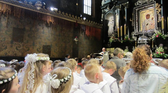 Children celebrating their first communion before the miraculous image of Our Lady of Częstochowa at Jasna Gora.