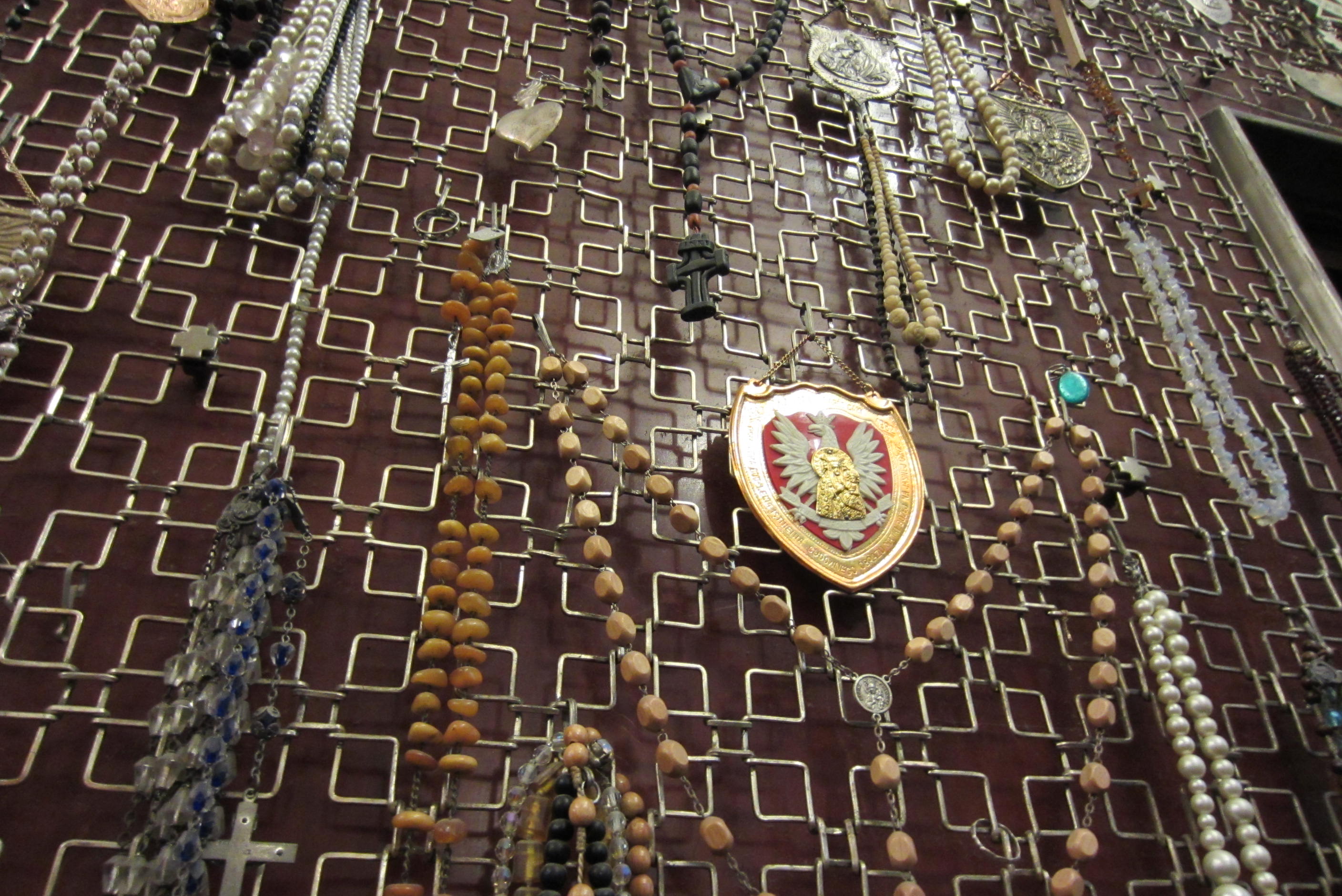 The walls of the church at Jasna Gora are lined with rosaries, jewelry, medals, and mementos of prayers granted.