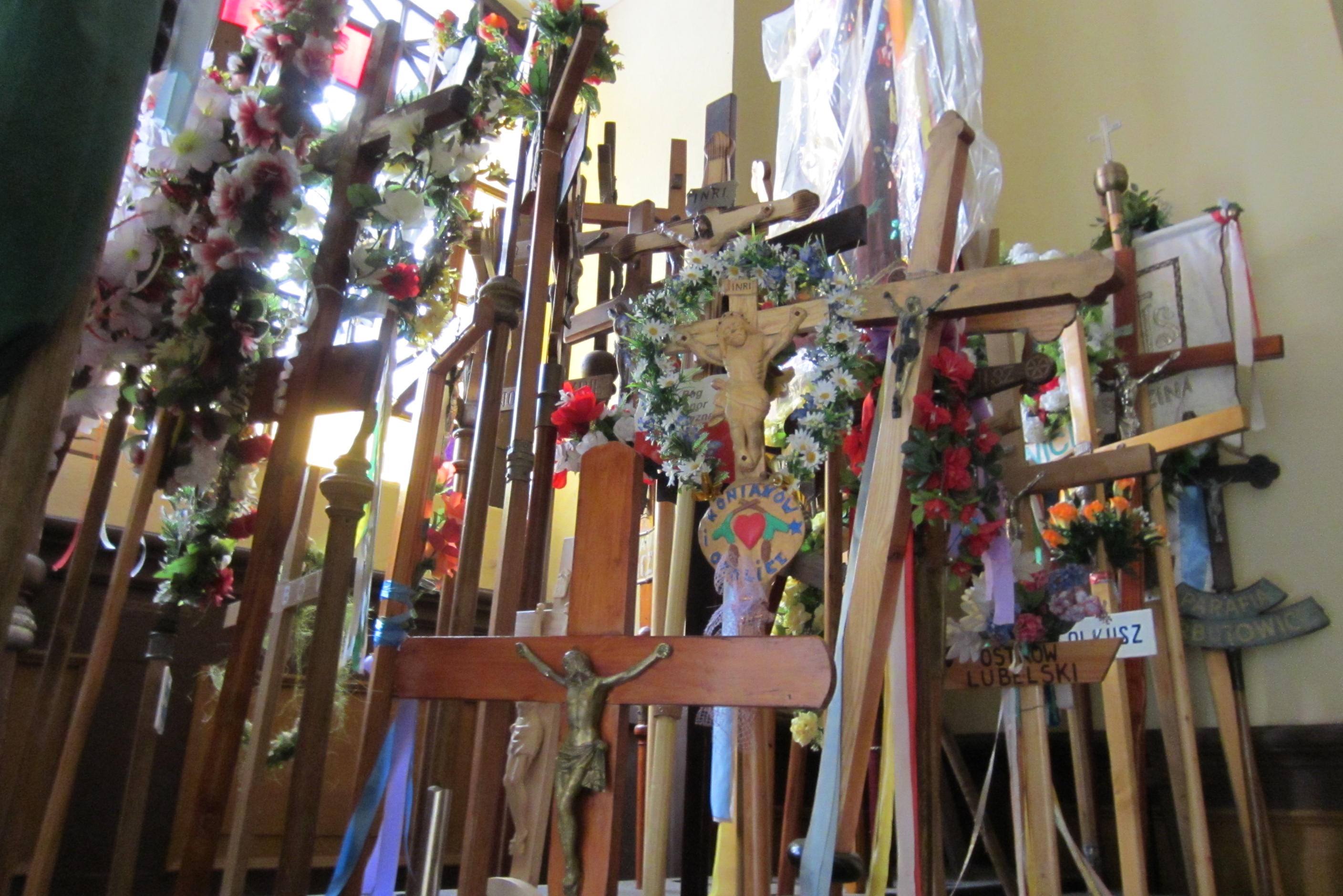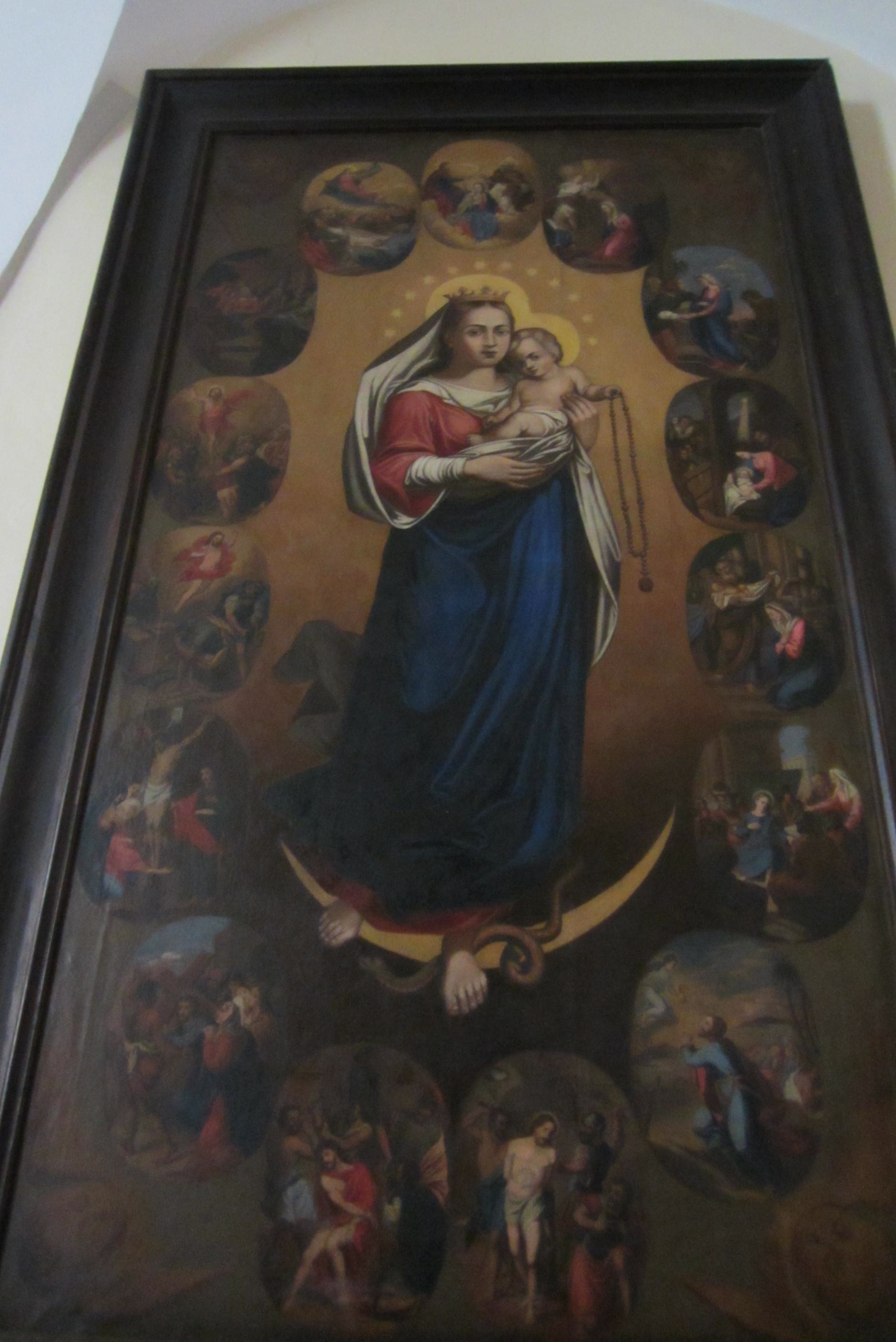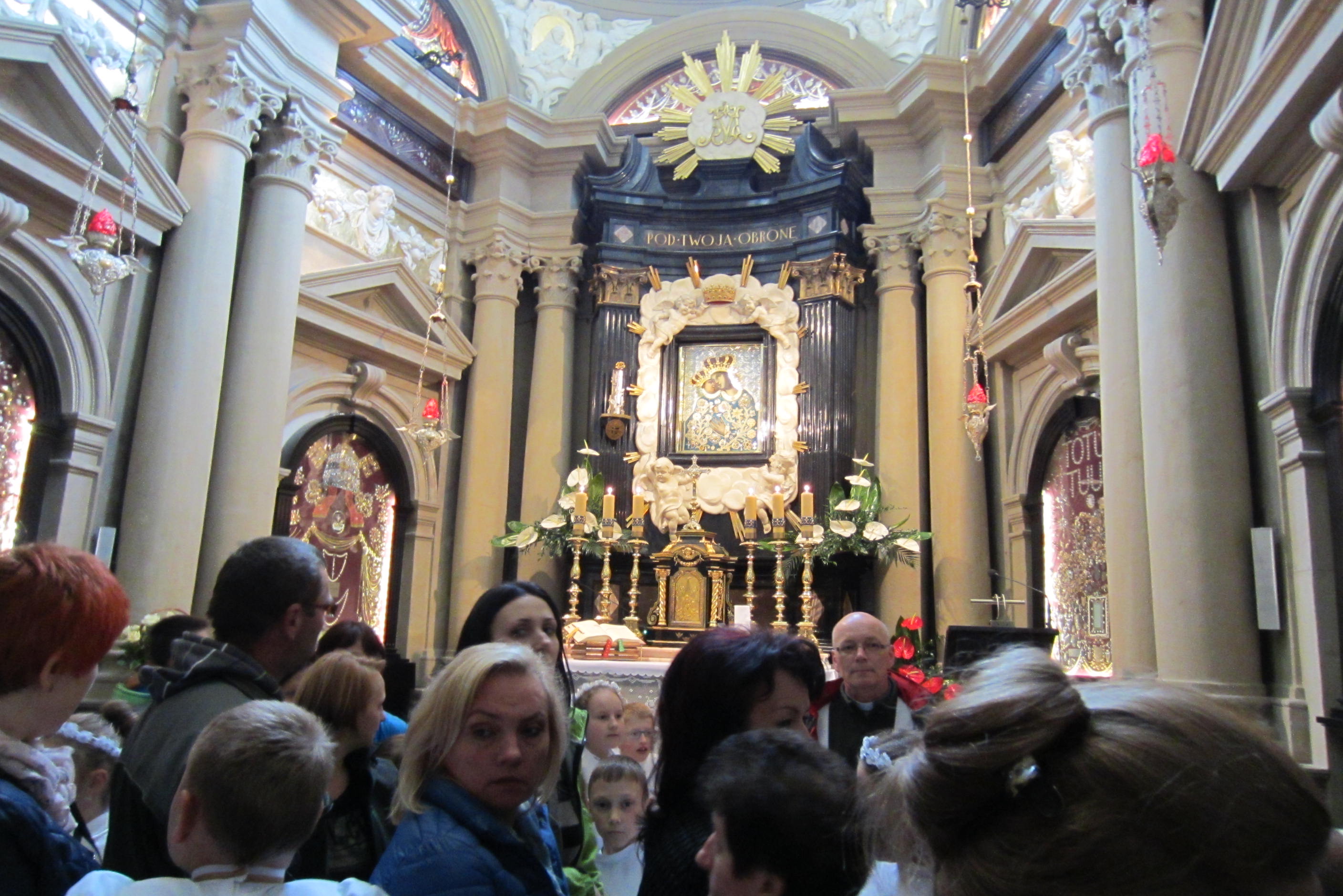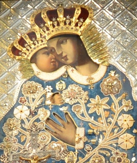“This is the Lady of Kalwaria,” he said pointing to a painting of the Virgin Mary with Jesus, both wearing royal crowns of red velvet and gold, clothed in blue garments alive with golden and bejeweled flowers. ”She is responsible for many miracles.”