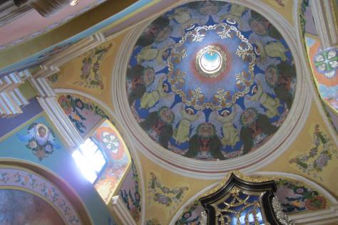 As we turned the corner and the church opened up—scenes of heaven and angels in pink, blue and yellow on the ceiling and massive, ornate altar in black marble and gold—the mass was ending. Lucas reverently made the sign of the cross and led me along the side, by cool grey marble walls with alcoves filled with sculptures and chubby cherubs to a crowded side chapel.